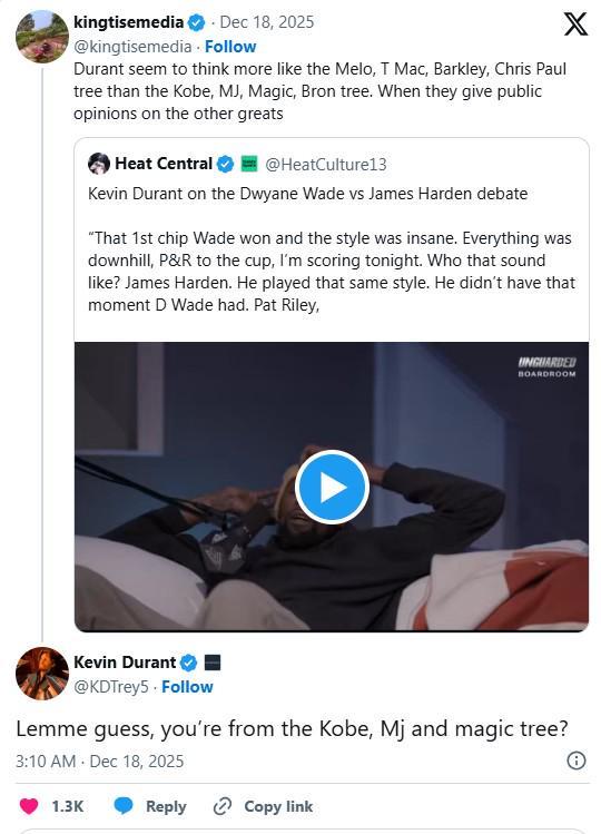 随后还有一名网友说道:“我们知道詹姆斯(哈登)是你的哥们儿,但韦德是一位更全面的球员,也是一位真正的赢家。这其实不是在争论谁更强,而是你更喜欢谁的问题。真正了解你的人都记得你在2013年或2014年左右就曾批评过韦德,当时你还试图吹捧哈登。哈哈。”杜兰特则回复道:“我知道每次我谈到篮球你们都会生气,因为2016年(加盟勇士)的事情,但当有人问你这个问题时,你想怎么回答就怎么回答,兄弟……我也会这么做。”